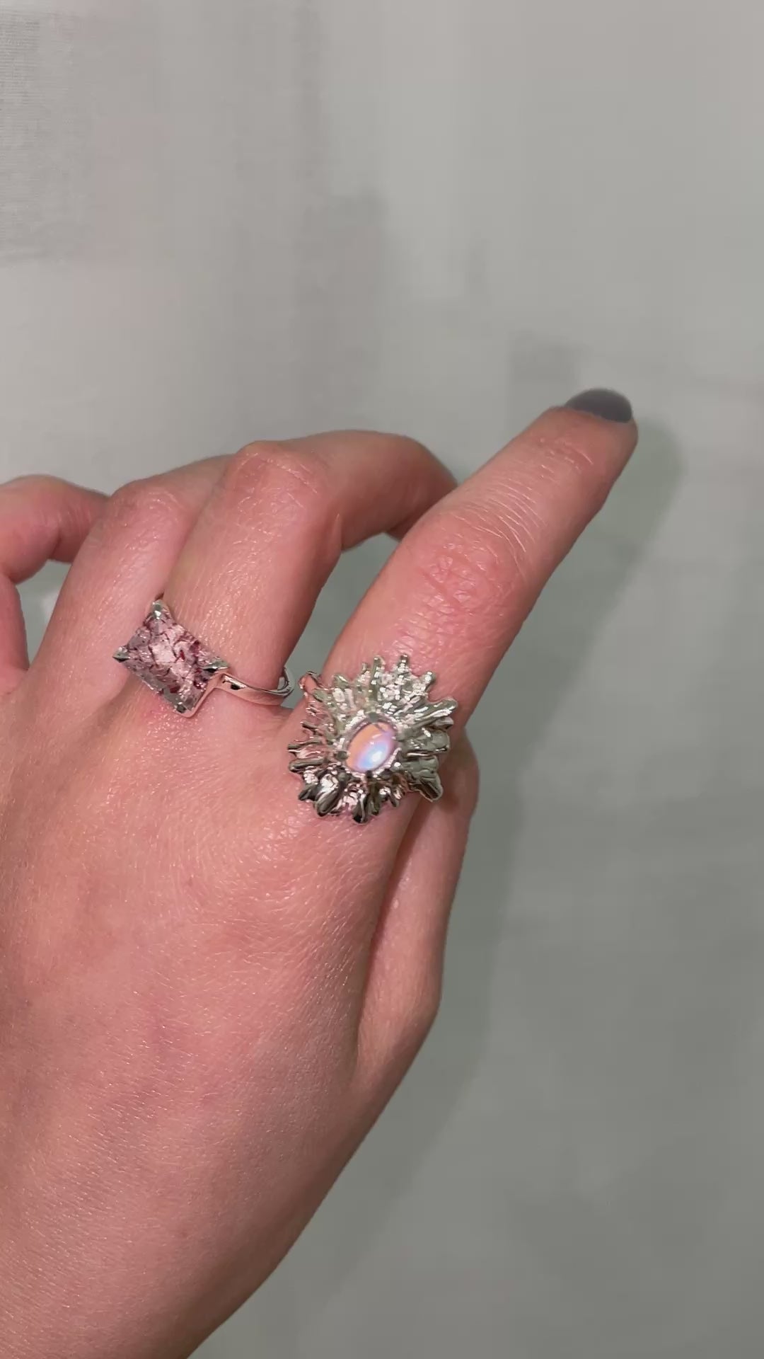 放射線状に広がる光の輪がスパイシーなムードを演出する一点物のリング。中央には神秘的に光るブルームーンストーンをセッティング。明るい場所では乳白色に、暗い場所では青く光ります。